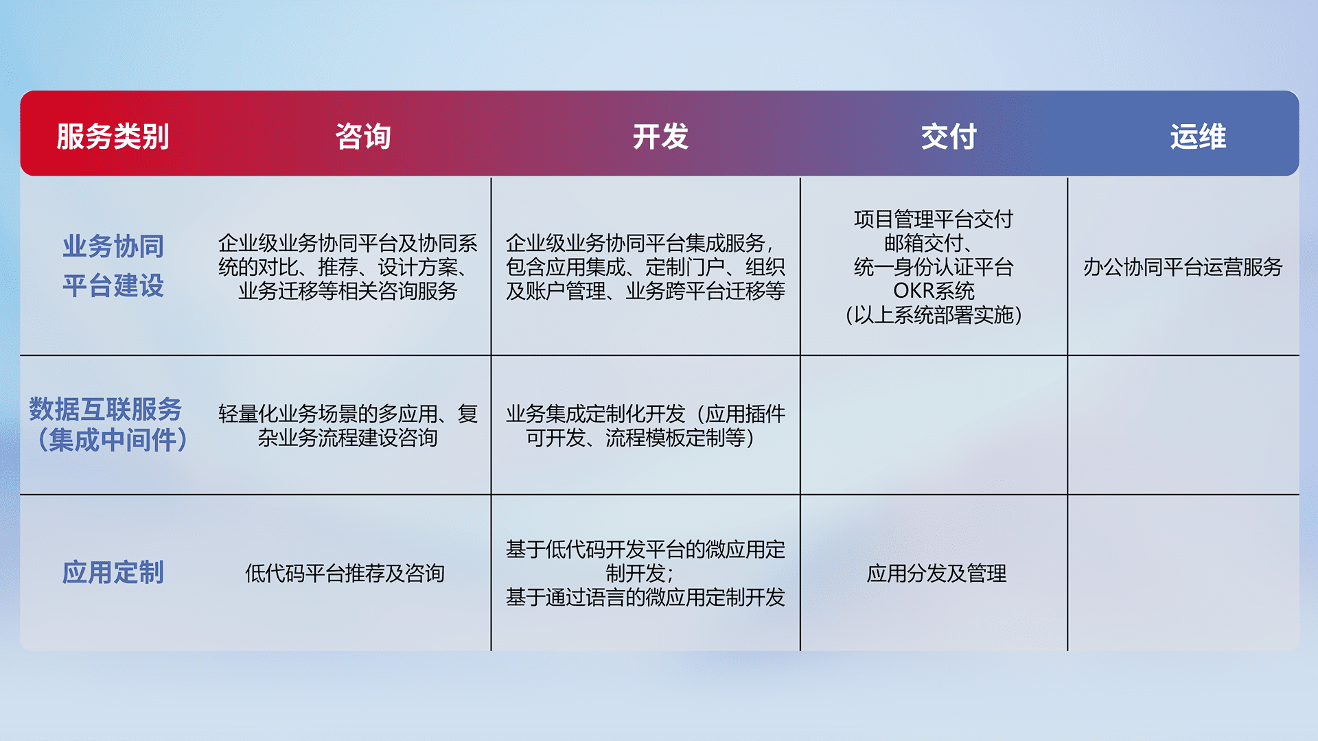 针对钉钉、、、、企微、、、、IDaas等平台级产品提供产品的规划、、方案、、、、交付、、、、定制化开发等服务,,,,实现如统一协同办公、、智能客户服务、、混合会议管理、、智能数据查询、、等业务场景,,实现数字化转型。。。。